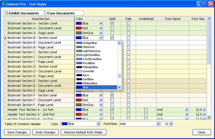 you can specify font colors and font size/style settings for every aspect of the generated PDF: bookmarks, table of contents and the page header text. Font styles and colors can even be different from section to section.